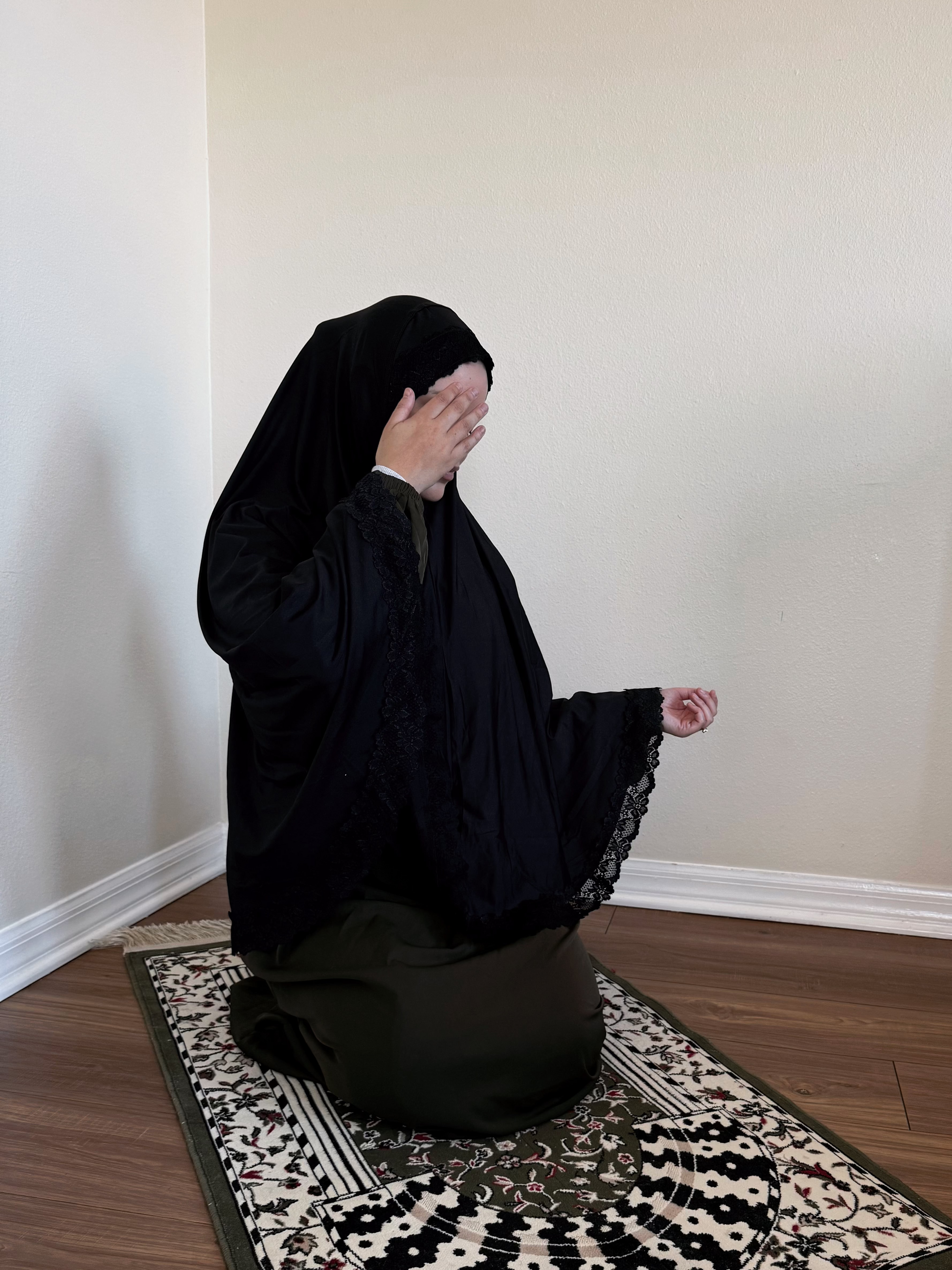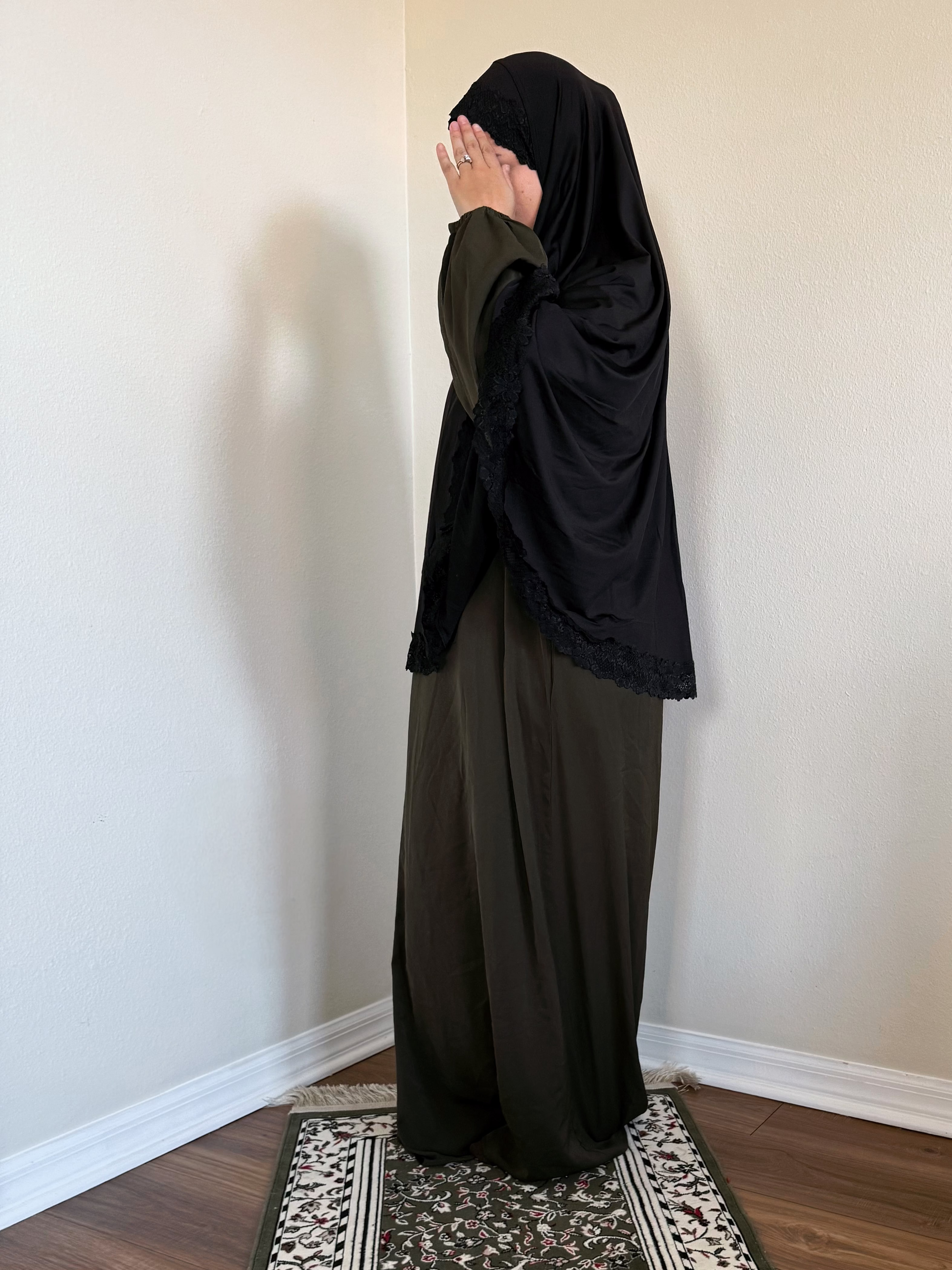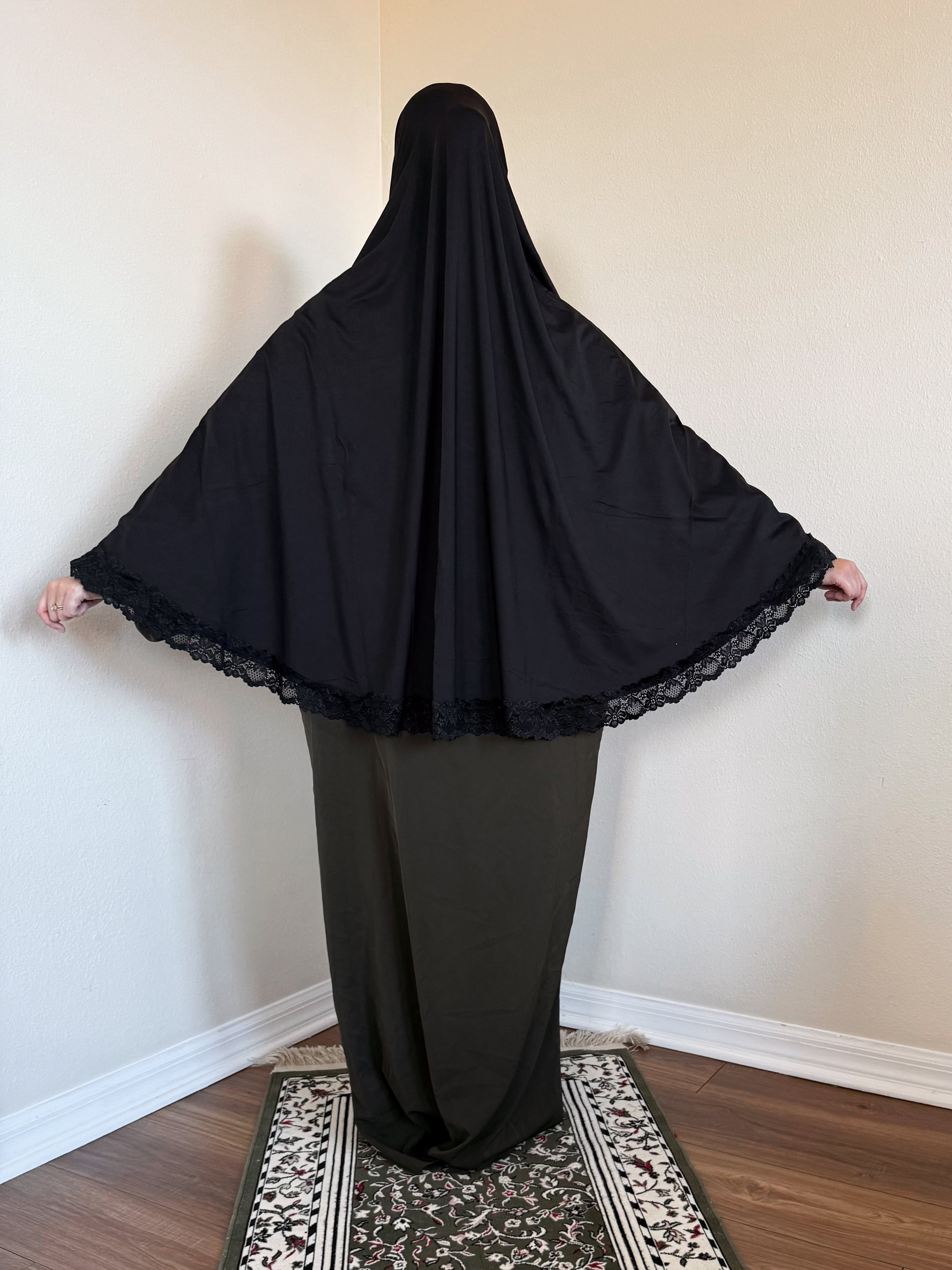 Experience the elegance of an instant khimar adorned with a stunning floral lace pattern, designed to elevate your style and make a lasting impression.